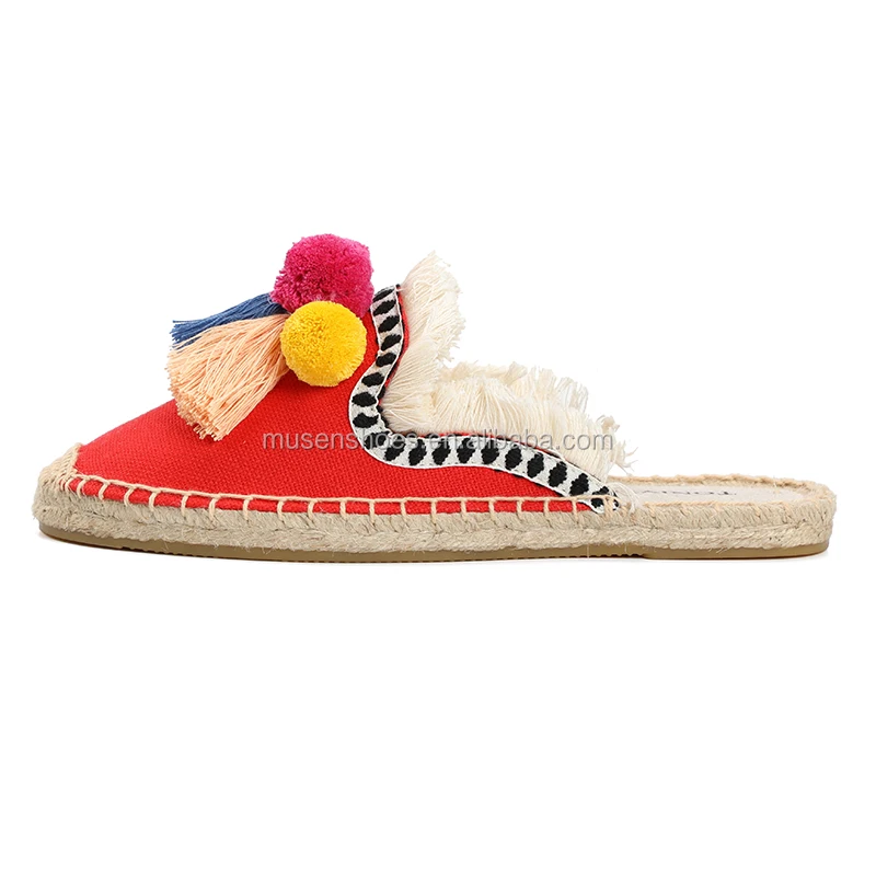 Women Mule Flat Shoes with Tassel Pompom Espadrilles Slides Backless Slipper Slip on Loafer Shoes Rubber CN Floral Beach Autumn
